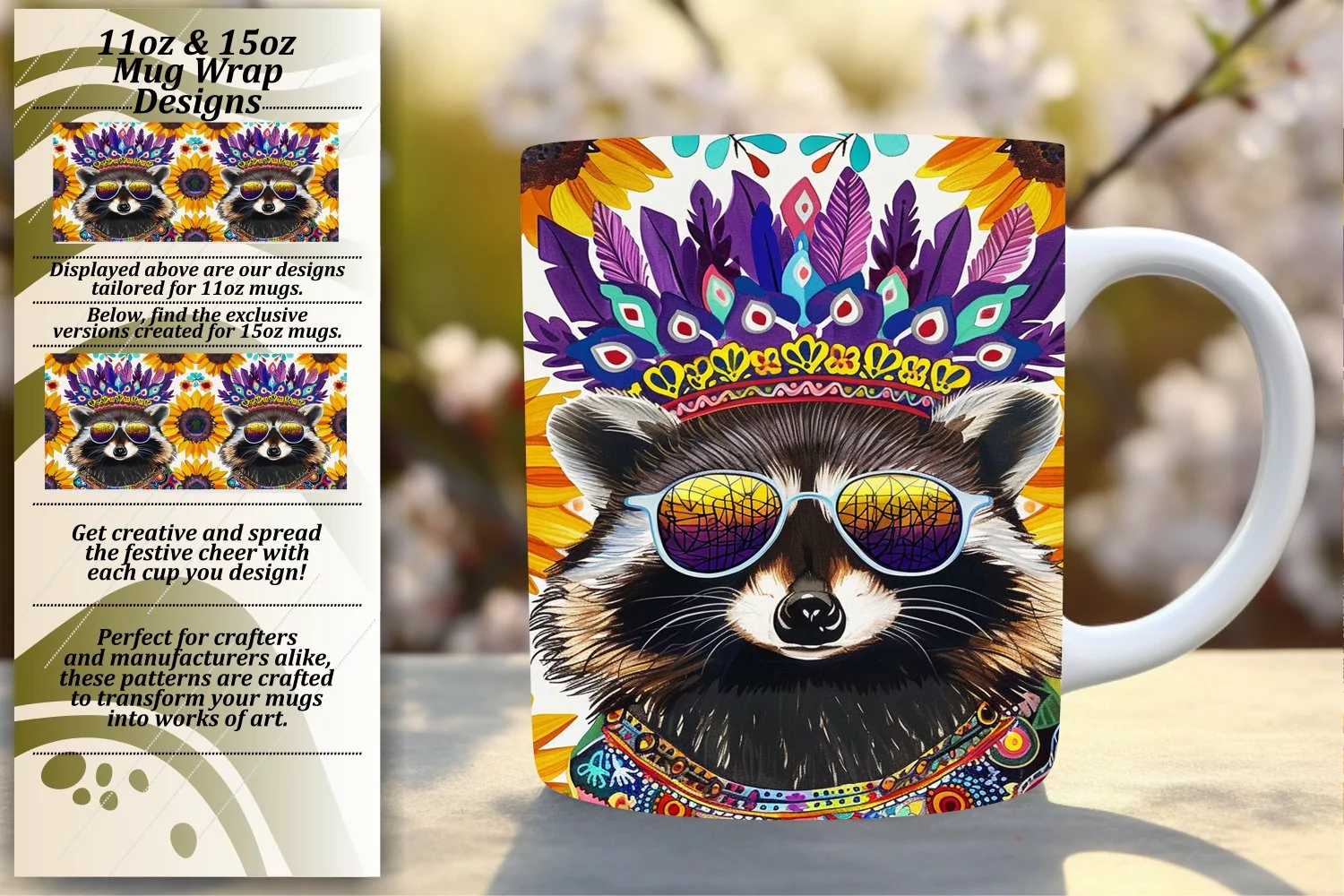11oz/15oz Mug Wrap: Raccoon with Colorful Flowers