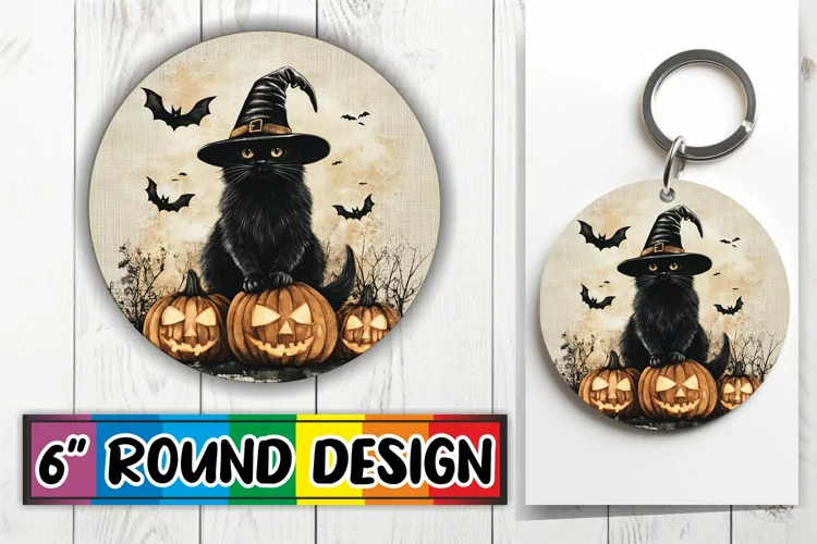 Fall Halloween Cat Round Design for Sublimation Keychain