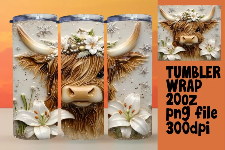 Highland Cow 20oz Tumbler Wrap Glossy 3D Flower Art example image 1