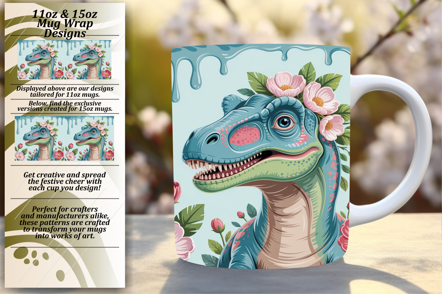 Enchanting 15oz Mug Wrap Png Template , Cute Dino example image 1