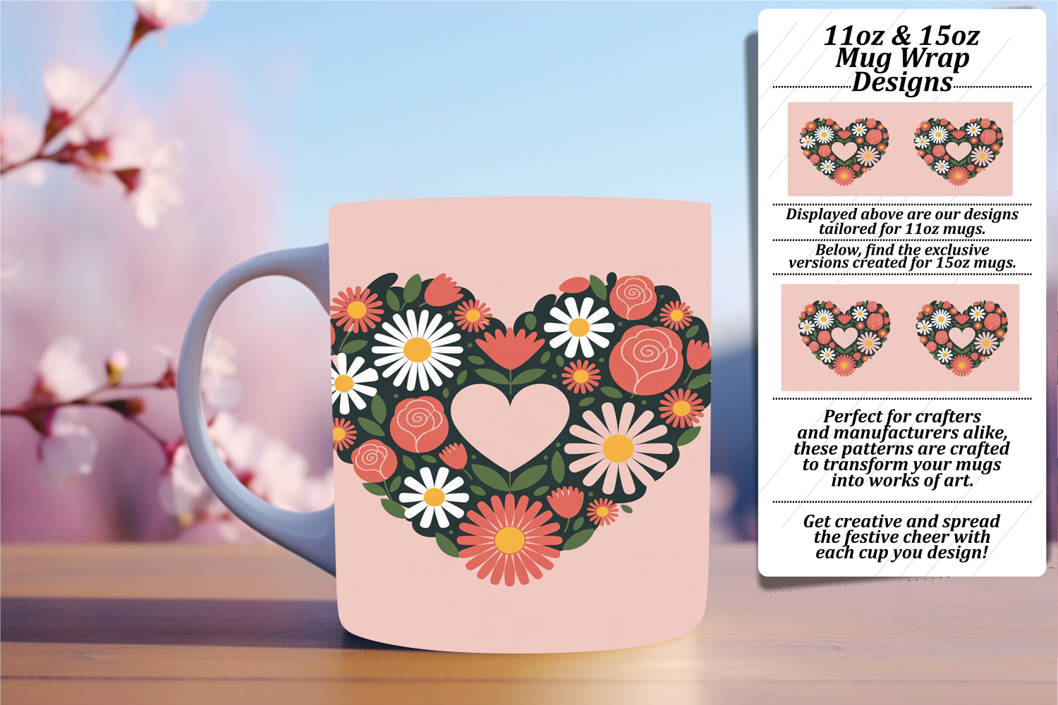 Lovely 15oz Mug Wrap Png Design , Flowers Heart