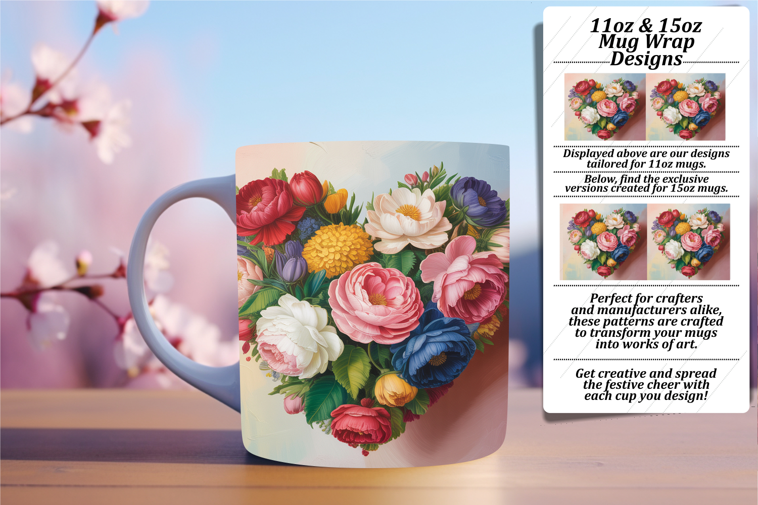 Stylish 11oz Mug Wrap Png Artwork , Flowers Heart