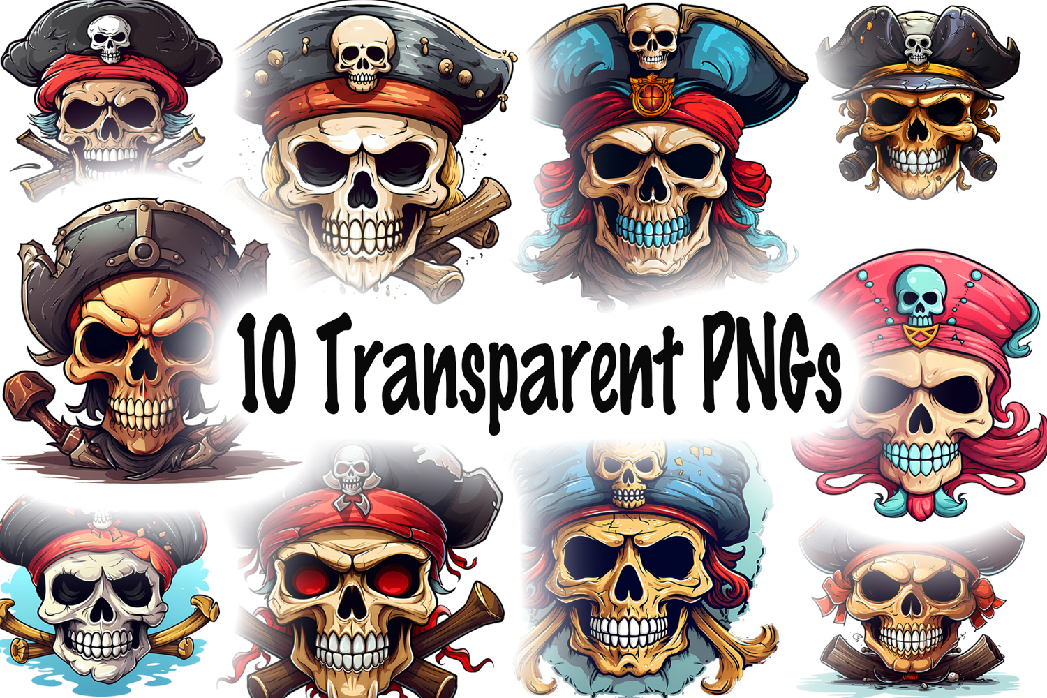 This bundle includes 10 fun skull and crossbones illustrations, each wearing different pirate hats, bandanas, and accessories. Designed in a playful cartoon style, these pirate skulls are perfect for Halloween, pirate parties, kids’ crafts, and nautical-themed projects. Each PNG is 5000x5000 px, 300 DPI, with a transparent background for easy layering.