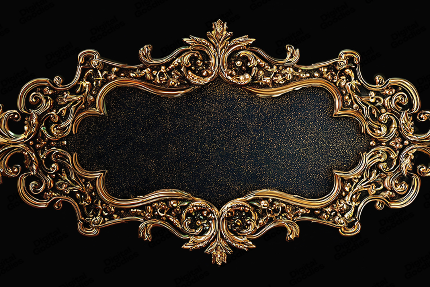 A luxurious gold ornate frame with intricate details, set against a black background with a sparkling effect. Perfect for holiday crafts, digital papers, invitations, and high-end design projects. Ideal for creating elegant cards, scrapbooking, sublimation printing, and artistic work, this sophisticated design adds a touch of vintage charm and luxury to any creative project.
