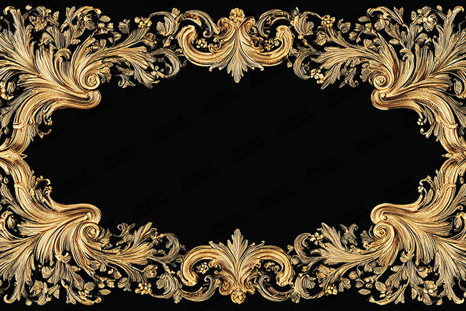 An elegant vintage gold ornate frame, set against a black background. Perfect for holiday crafts, digital papers, invitations, and luxury design projects. Ideal for creating sophisticated cards, scrapbooking, sublimation printing, and artistic work, this frame adds a touch of timeless elegance and luxury to any creative project.