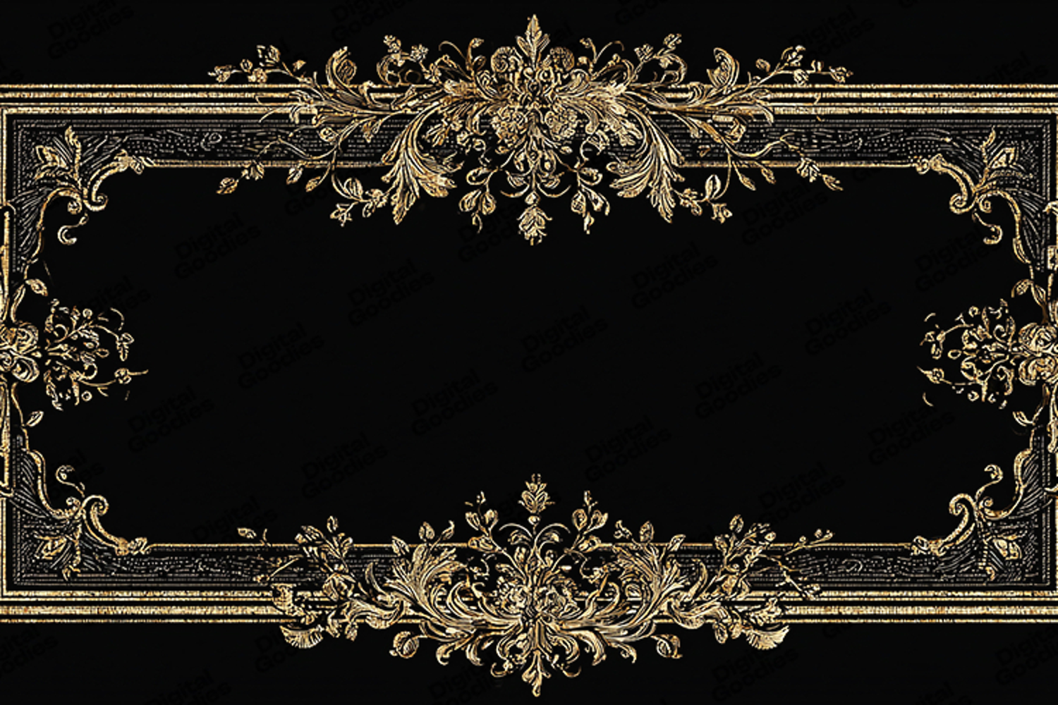 An elegant ornate gold frame with intricate floral detailing, set against a black background. Perfect for holiday crafts, digital papers, invitations, and luxury design projects. Ideal for creating sophisticated cards, scrapbooking, sublimation printing, and artistic work, this ornate frame adds a timeless touch of elegance and luxury to any creative project.