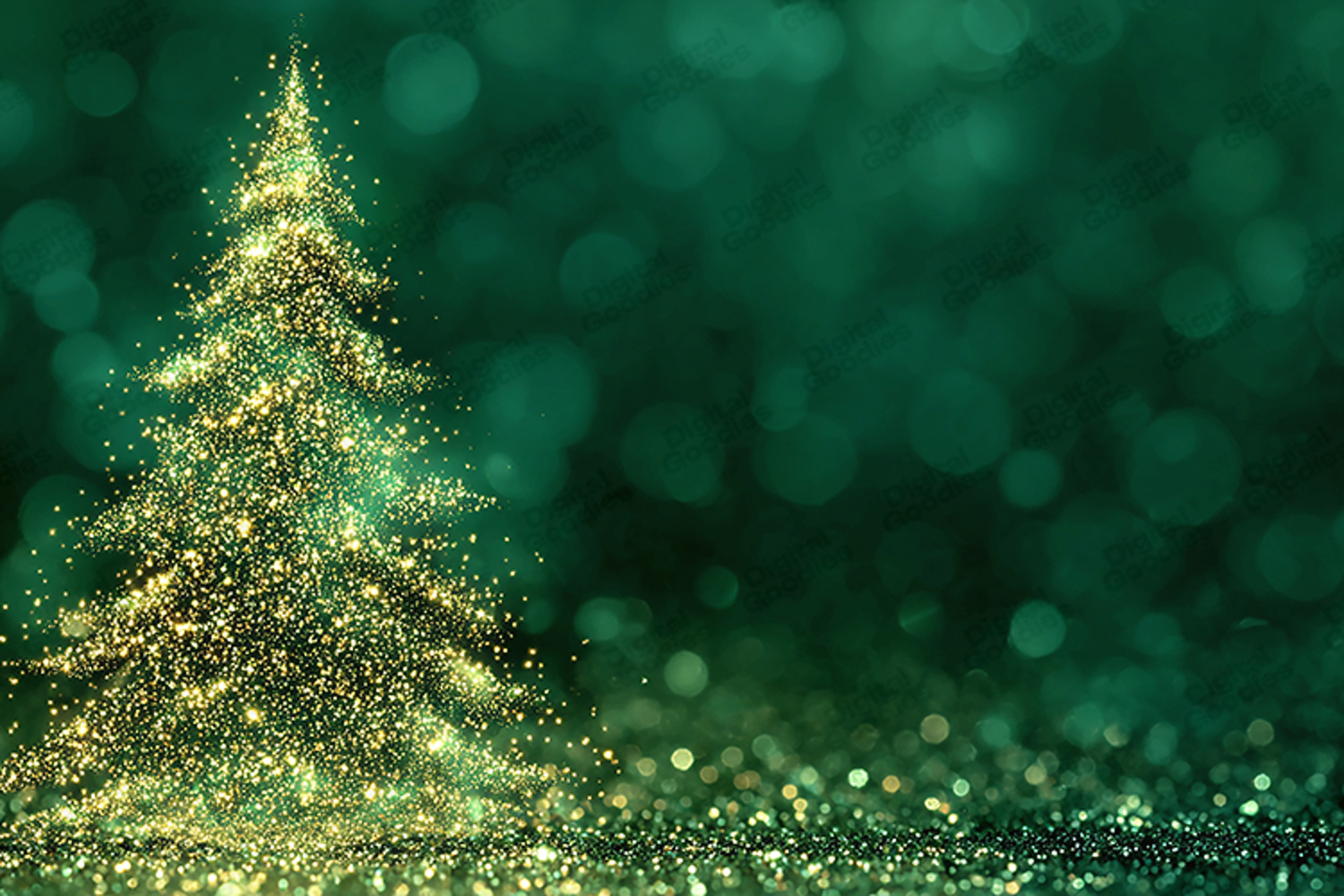 A sophisticated and luxurious image featuring a shimmering Christmas tree silhouette composed of glowing gold and green particles, set against a rich emerald green bokeh background with a sparkling glitter foreground. This elegant holiday backdrop is perfect for high-end digital cards, corporate announcements, and seasonal marketing. Ideal for printing, banners, and sublimation, this emerald tree background adds a powerful sense of rich color, festive luxury, and sparkling elegance to any creative project.