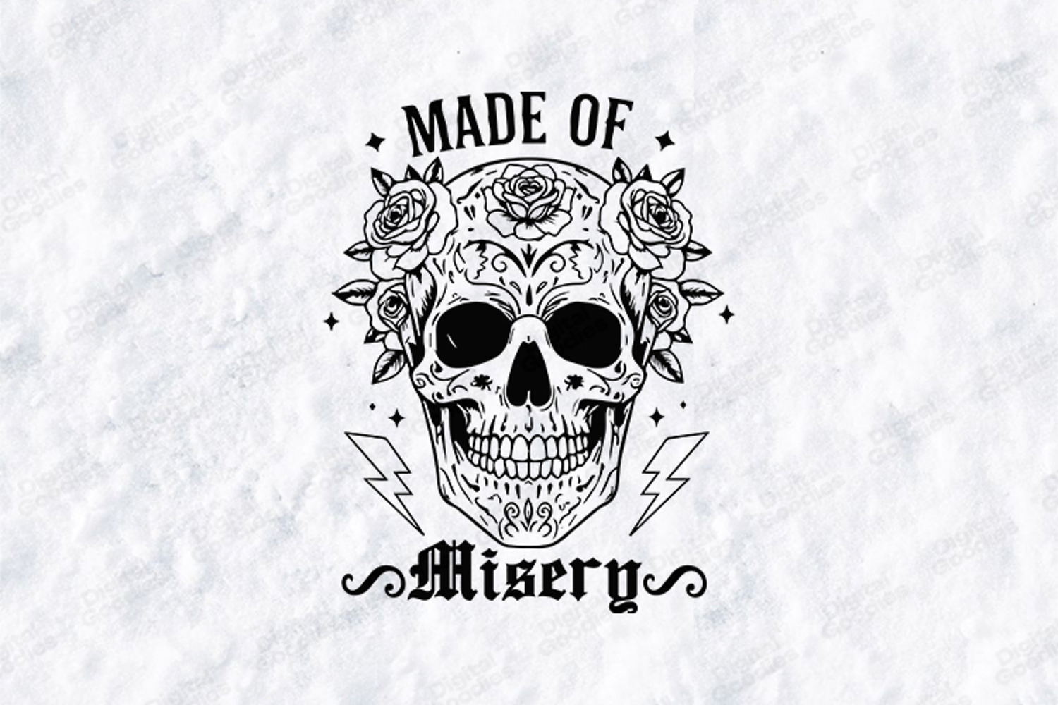 This Made Of Misery skull design features floral details, lightning accents and star elements for a bold gothic and grunge inspired look. Perfect for punk fashion, alternative outfits and rock themed apparel. Suitable for printing on shirts, hoodies and accessories.
