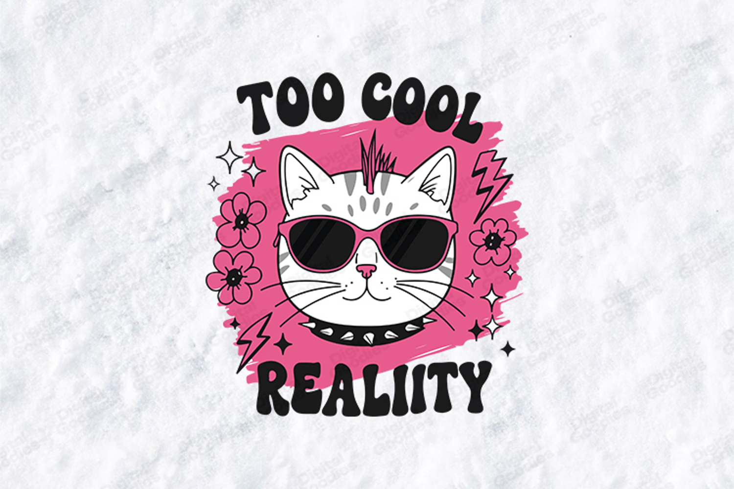 This Too Cool Reality cat design features bold sunglasses, floral details and lightning accents for a fun and trendy look. Perfect for cat lovers and stylish casual outfits. Works great for printing on shirts, hoodies and accessories.