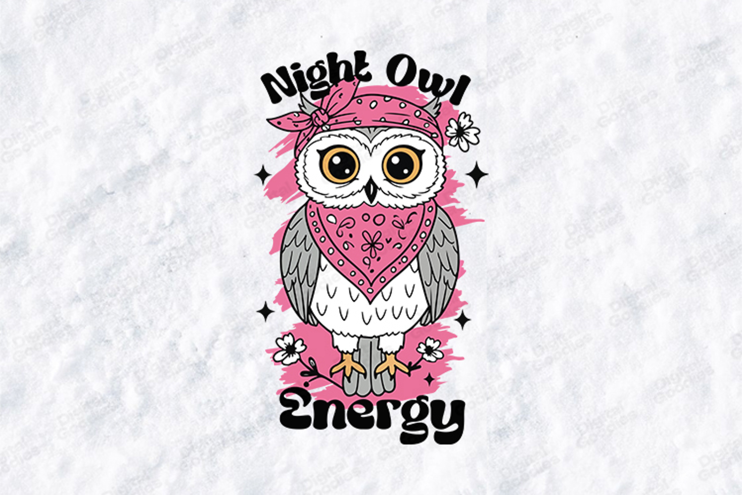 This Night Owl Energy owl design features detailed artwork, floral accents and modern pink highlights for a stylish and fun look. Ideal for bird lovers and trendy fashion outfits. Perfect for printing on shirts, hoodies and accessories.