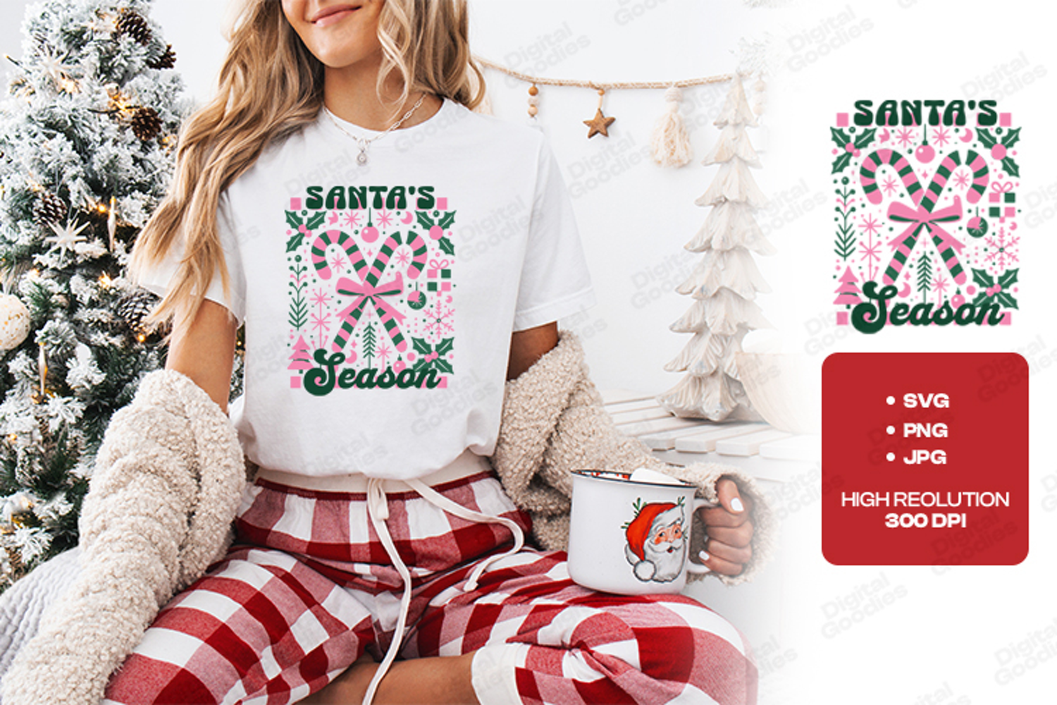 Celebrate the festive season with this Santa's Season design, featuring a candy cane surrounded by holiday greenery. Perfect for spreading Christmas cheer, this design is ideal for festive outfits. Great for printing on shirts, hoodies, and accessories to showcase the joy of Christmas.