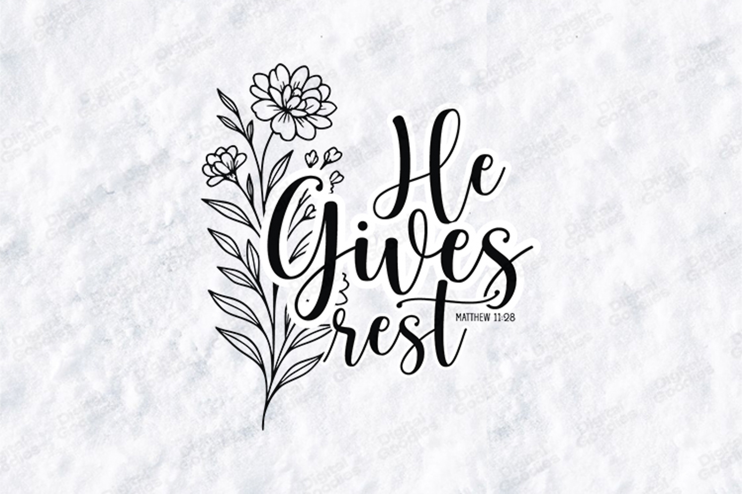 "He Gives Rest" Matthew 11:28 is a peaceful and uplifting design that invites comfort and solace. With elegant floral accents, it embodies the soothing promise from scripture, offering both spiritual encouragement and tranquility. Perfect for Christian-themed apparel, gifts, and messages of rest in God.