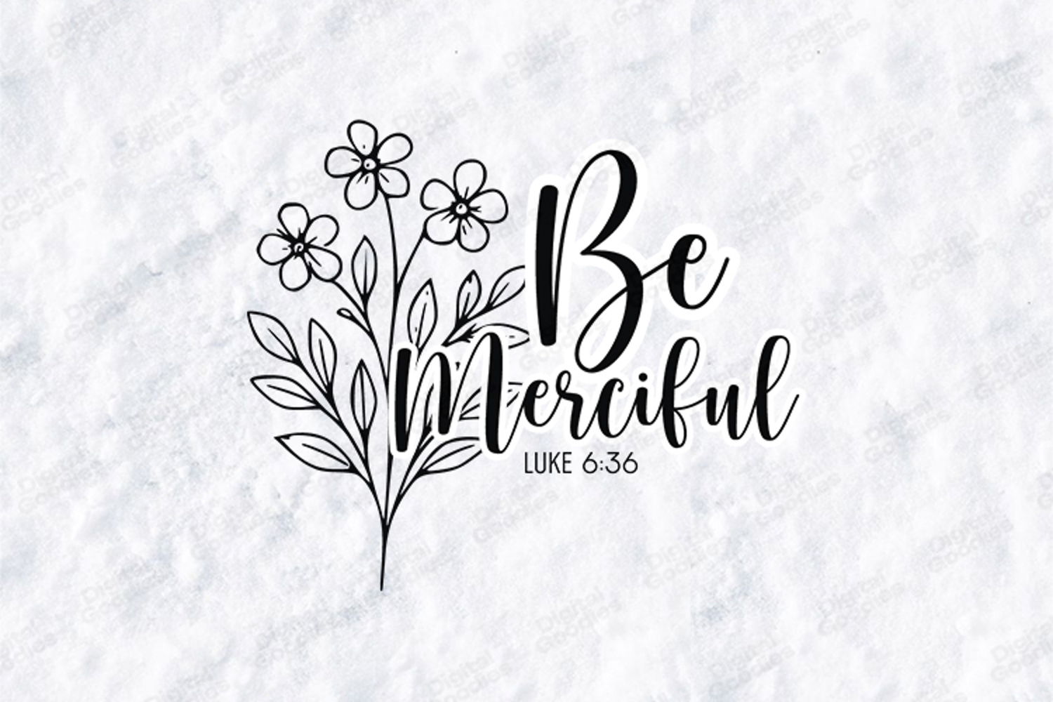 Beautiful "Be Merciful" floral quote design featuring the Bible verse Luke 6:36. Perfect for Christian-themed projects such as T-shirts, wall art, greeting cards, and more. This high-quality SVG design brings a message of mercy and compassion. Ideal for sublimation, scrapbooking, and crafting.
