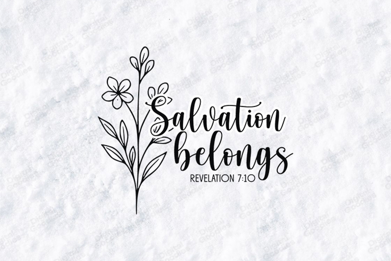 Beautiful "Salvation Belongs" floral quote design featuring the Bible verse Revelation 7:10. Perfect for Christian-themed projects like T-shirts, wall art, greeting cards, and more. This high-quality SVG design carries a message of salvation and hope. Ideal for sublimation, scrapbooking, and crafting.