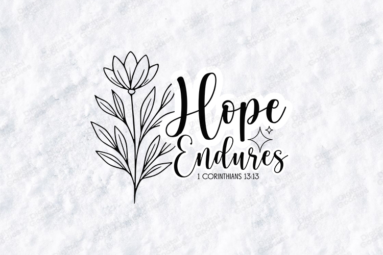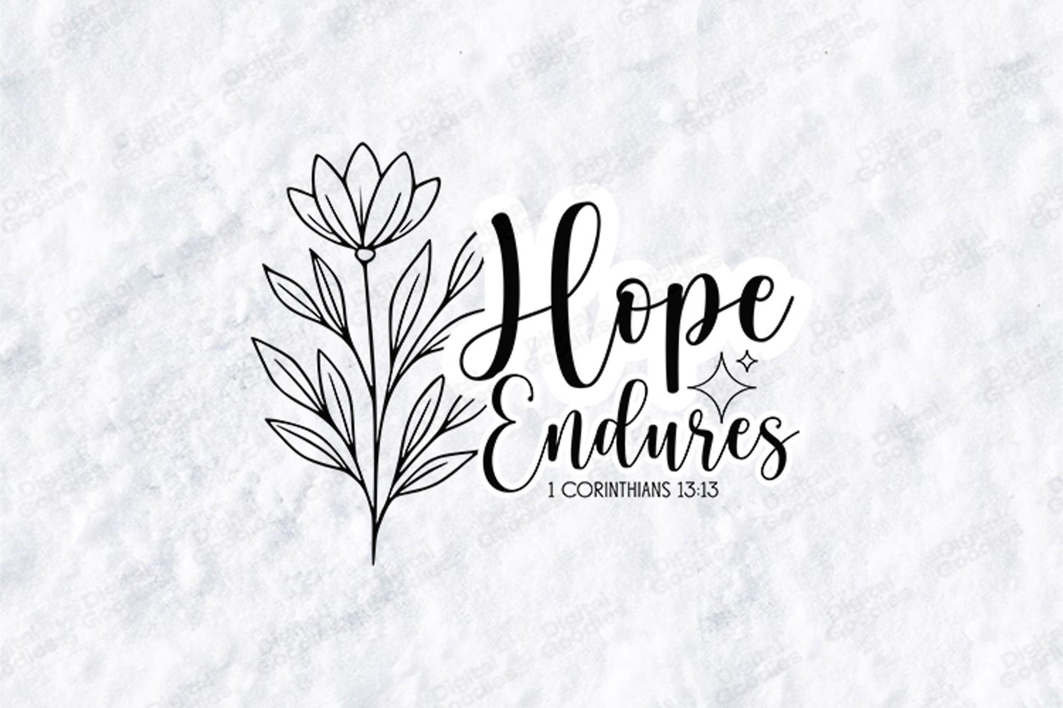 Beautiful "Hope Endures" floral quote design featuring the Bible verse 1 Corinthians 13:13. Perfect for Christian-themed projects like T-shirts, wall art, greeting cards, and more. This high-quality SVG design carries a message of hope and endurance. Ideal for sublimation, scrapbooking, and crafting.