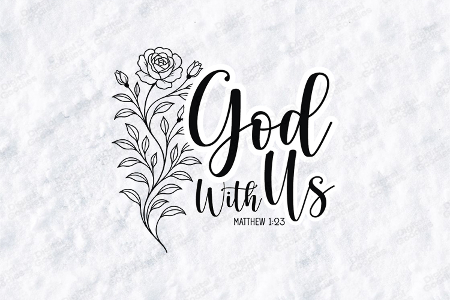 Beautiful "God With Us" floral quote design featuring the Bible verse Matthew 1:23. Perfect for Christian-themed projects like T-shirts, wall art, greeting cards, and more. This high-quality SVG design conveys a message of God's presence and love. Ideal for sublimation, scrapbooking, and crafting.