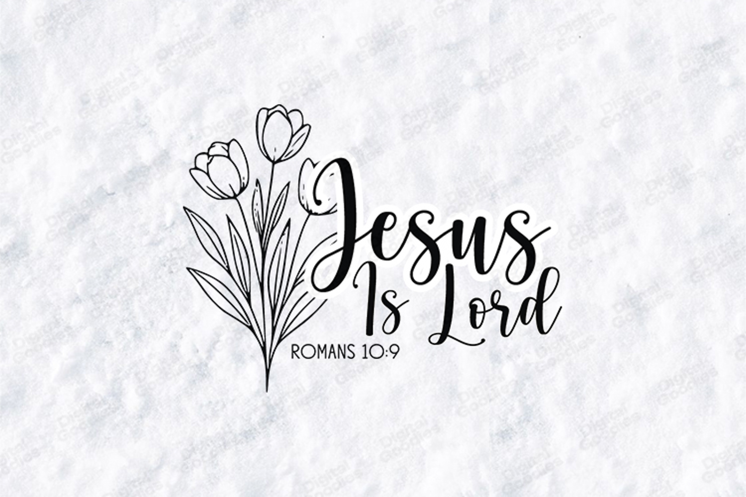Beautiful "Jesus Is Lord" floral quote design featuring the Bible verse Romans 10:9. Perfect for Christian-themed projects like T-shirts, wall art, greeting cards, and more. This high-quality SVG design conveys a message of faith in Christ. Ideal for sublimation, scrapbooking, and crafting.