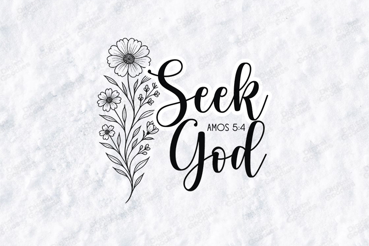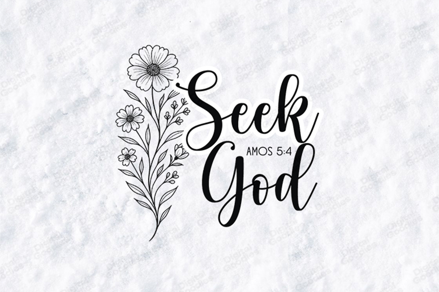 Beautiful "Seek God" floral quote design featuring the Bible verse Amos 5:4. Perfect for Christian-themed projects like T-shirts, wall art, greeting cards, and more. This high-quality SVG design conveys a powerful message of seeking God's presence. Ideal for sublimation, scrapbooking, and crafting.