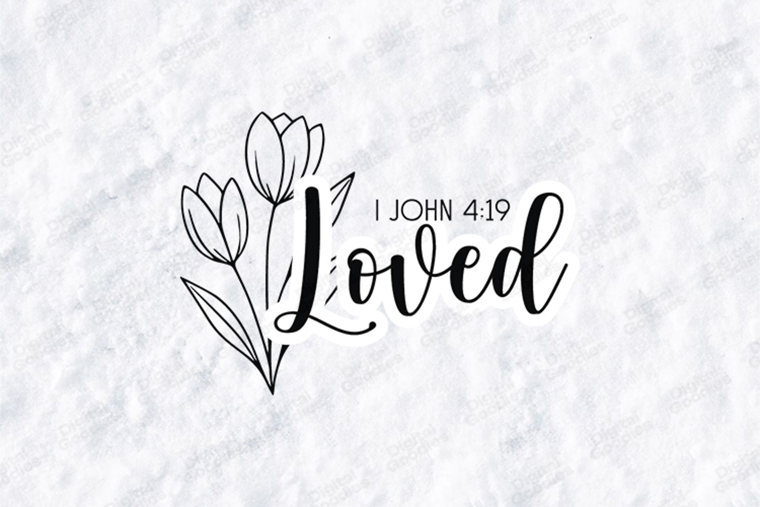 Beautiful "Loved" floral quote design featuring the Bible verse 1 John 4:19. Perfect for Christian-themed projects like T-shirts, wall art, greeting cards, and more. This high-quality SVG design conveys the message of God's love. Ideal for sublimation, scrapbooking, and crafting.