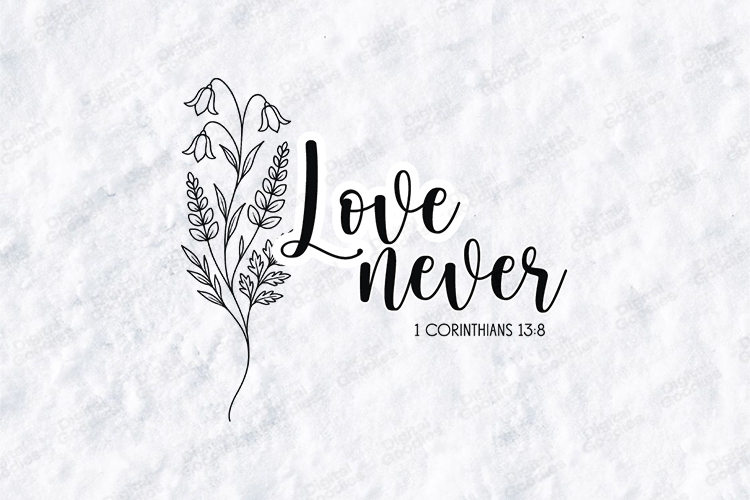 Beautiful "Love Never" floral quote design featuring the Bible verse 1 Corinthians 13:8. Perfect for Christian-themed projects like T-shirts, wall art, greeting cards, and more. This high-quality SVG design conveys a timeless message of love. Ideal for sublimation, scrapbooking, and crafting.