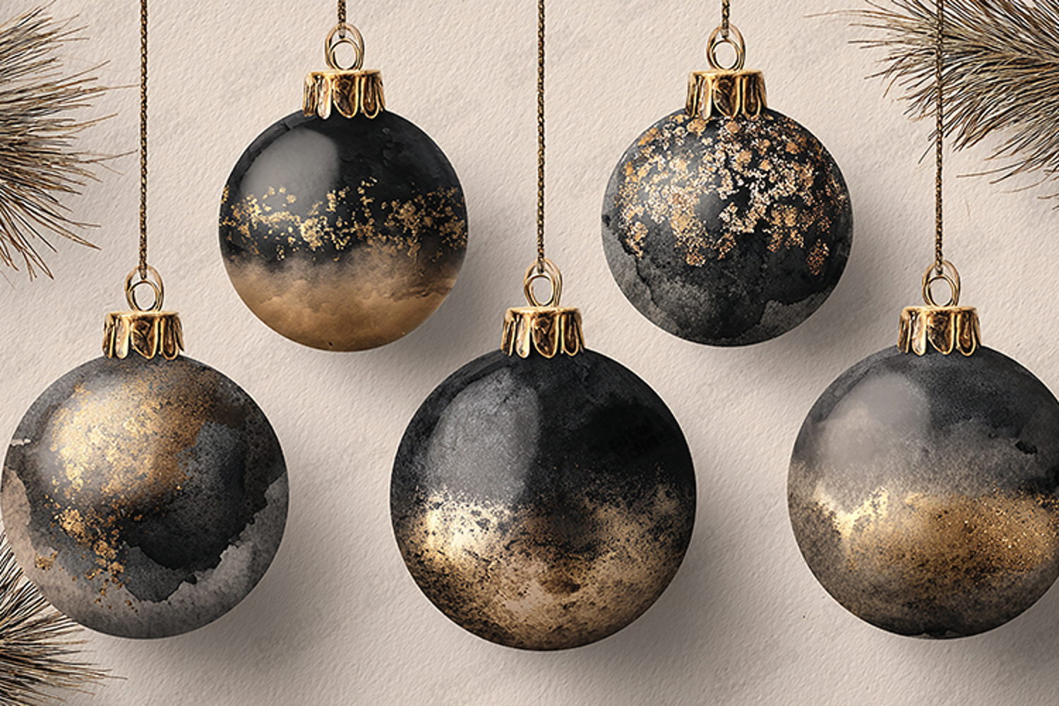 Modern Watercolor Ornaments Holiday Gold Black Christmas Luxury Abstract Festive