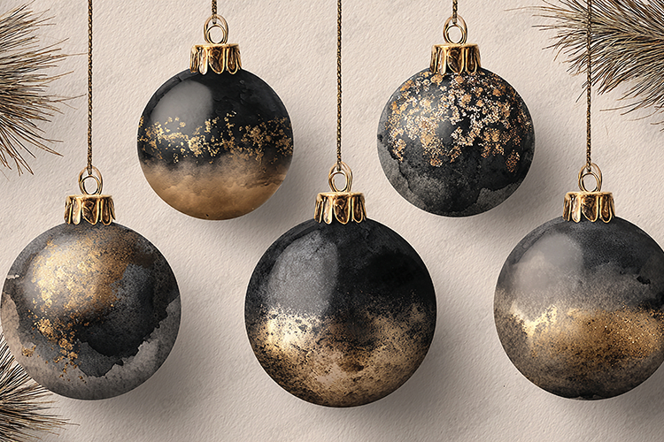 A sophisticated and modern background featuring five hanging Christmas baubles with an artistic black watercolor and shimmering gold foil finish. This elegant design is perfect for luxury holiday projects, digital invitations, upscale marketing materials, greeting cards, website banners, and seasonal sublimation designs. The combination of deep black and glittering gold provides a chic, contemporary twist on traditional Christmas decor.