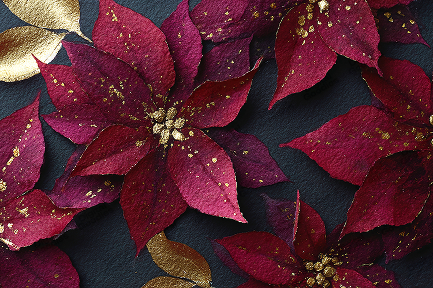 A stunning, luxurious close-up background featuring deep crimson and magenta poinsettia petals dramatically accented with rich gold foil splatter and delicate metallic leaves. Set against a dark, dramatic backdrop, this image highlights the detailed texture of the flowers. Ideal for high-end holiday creations, including premium greeting cards, sophisticated seasonal marketing, sublimation products, and digital papers, this design offers a dramatic and glamorous take on traditional Christmas flora.