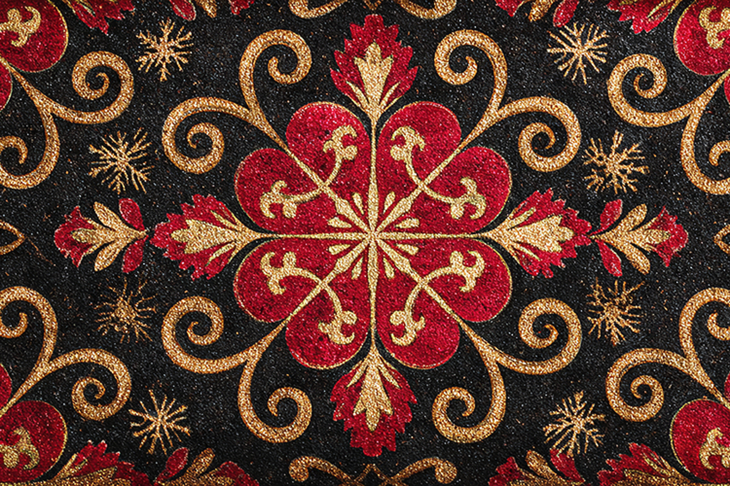 A luxurious and vibrant seamless pattern featuring a detailed red and gold glitter baroque damask design set against a deep black textured background. The repeating ornamental motif and rich colors make this an exceptionally elegant texture. Perfect for high-end Christmas and New Year projects, including sophisticated greeting cards, luxurious wrapping paper, digital paper packs, party invitations, and print-on-demand products, adding instant glamour and festive opulence.