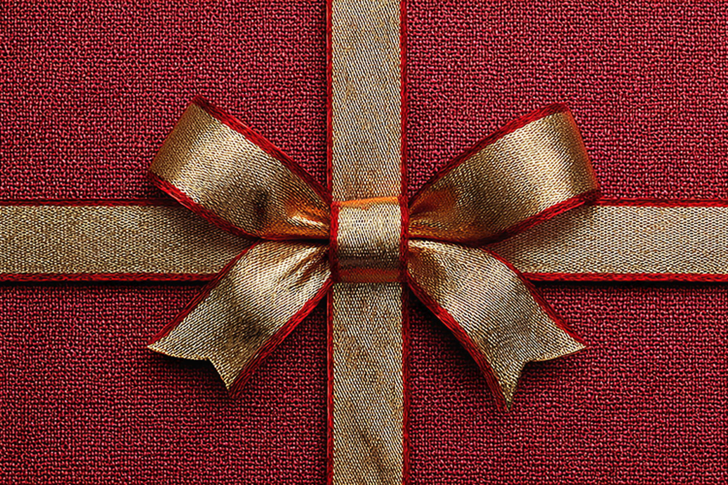 "Gold Fabric Ribbon Bow on Red Woven Texture Background" example image 1