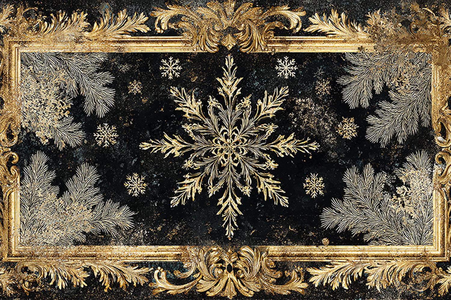 A high-resolution, rich digital background featuring an antique, distressed black and dark gold texture. The image is framed by a highly ornate, baroque-style gold border, with a striking large central golden snowflake and corners accented with metallic pine needles. This design evokes classic, luxurious vintage style. This JPG is perfect for creating sophisticated holiday invitations, high-end greeting cards, presentation backdrops, certificates, and sublimation prints. This elegant frame adds drama, timeless glamour, and rich festive detail to any creative project.
