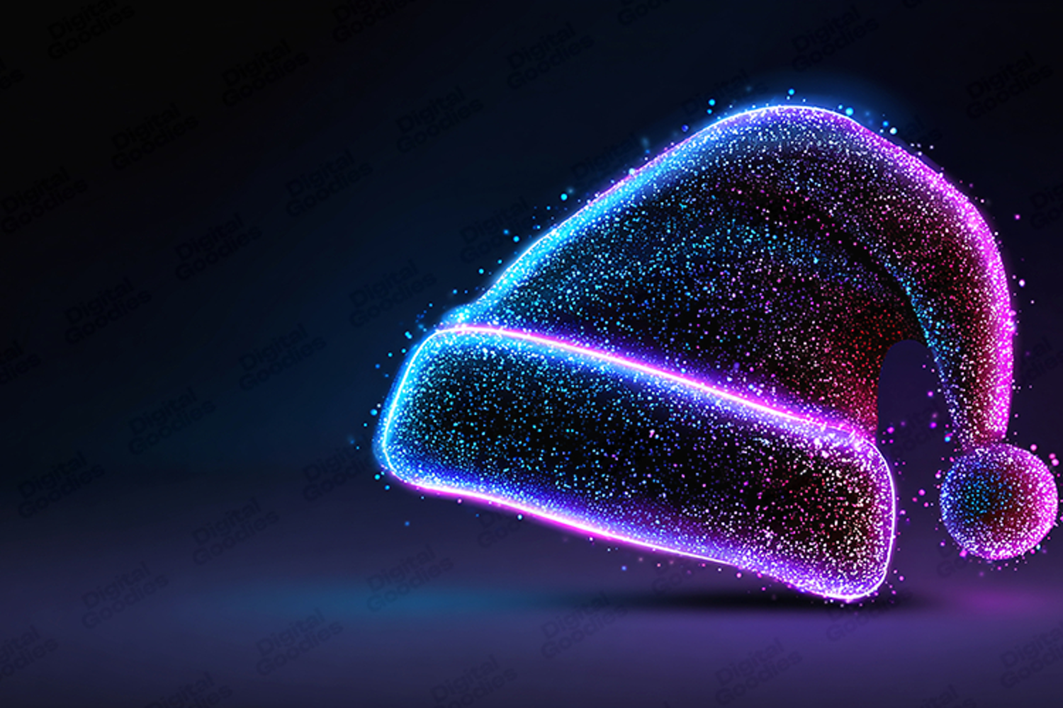 Electrifying and modern digital art featuring a stunning abstract Santa hat composed entirely of glowing particles. The neon glow transitions dramatically from blue to magenta and purple against a sleek, dark background, making it perfect for unique holiday graphics and seasonal designs. Ideal for social media banners, Christmas cards, festive digital papers, and sublimation printing, this dynamic particle illustration adds a stylish, high-tech sparkle and holiday cheer to any creative project.
