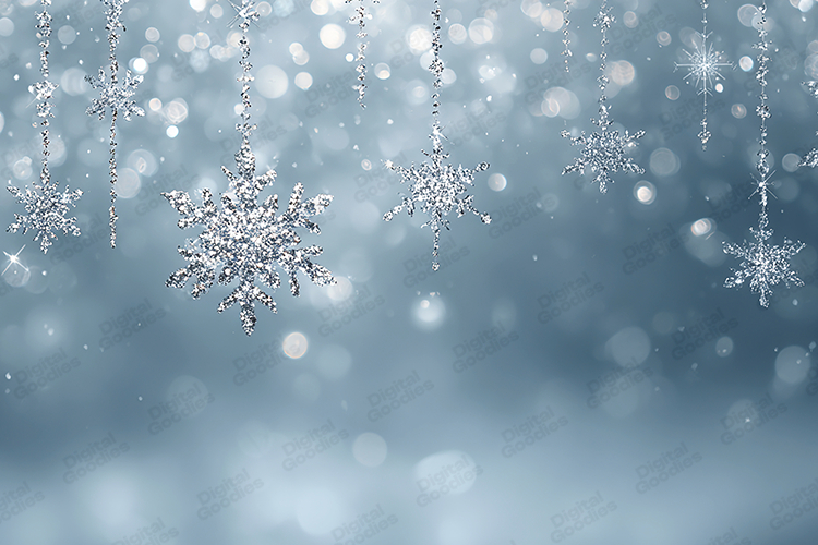 An elegant, high-resolution digital background featuring several intricately cut silver glitter snowflakes hanging on shimmering threads against a soft, dreamy blue and white bokeh backdrop. The blurred lights and gentle snowfall effect create a serene and luxurious winter atmosphere. This image is perfect for holiday cards, elegant winter party invitations, New Year's Eve designs, digital paper, and seasonal product mockups, adding sophisticated sparkle and seasonal cheer to any creative project.