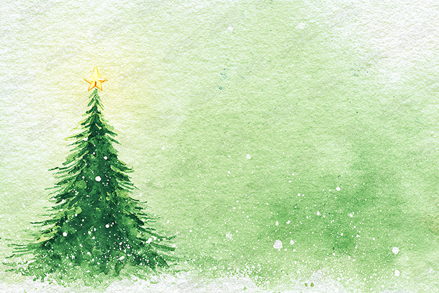 A gentle, high-resolution digital background featuring a watercolor painting of a Christmas tree with a glowing gold star, lightly dusted with snow. The background is a soft, textured wash of light green and white, with the central and right area intentionally lighter to provide ample space for custom text, a photo, or a holiday greeting. This image is perfect for holiday cards, seasonal announcements, artistic digital paper, winter flyers, and print-on-demand projects, adding a charming, spacious, and festive hand-painted aesthetic.