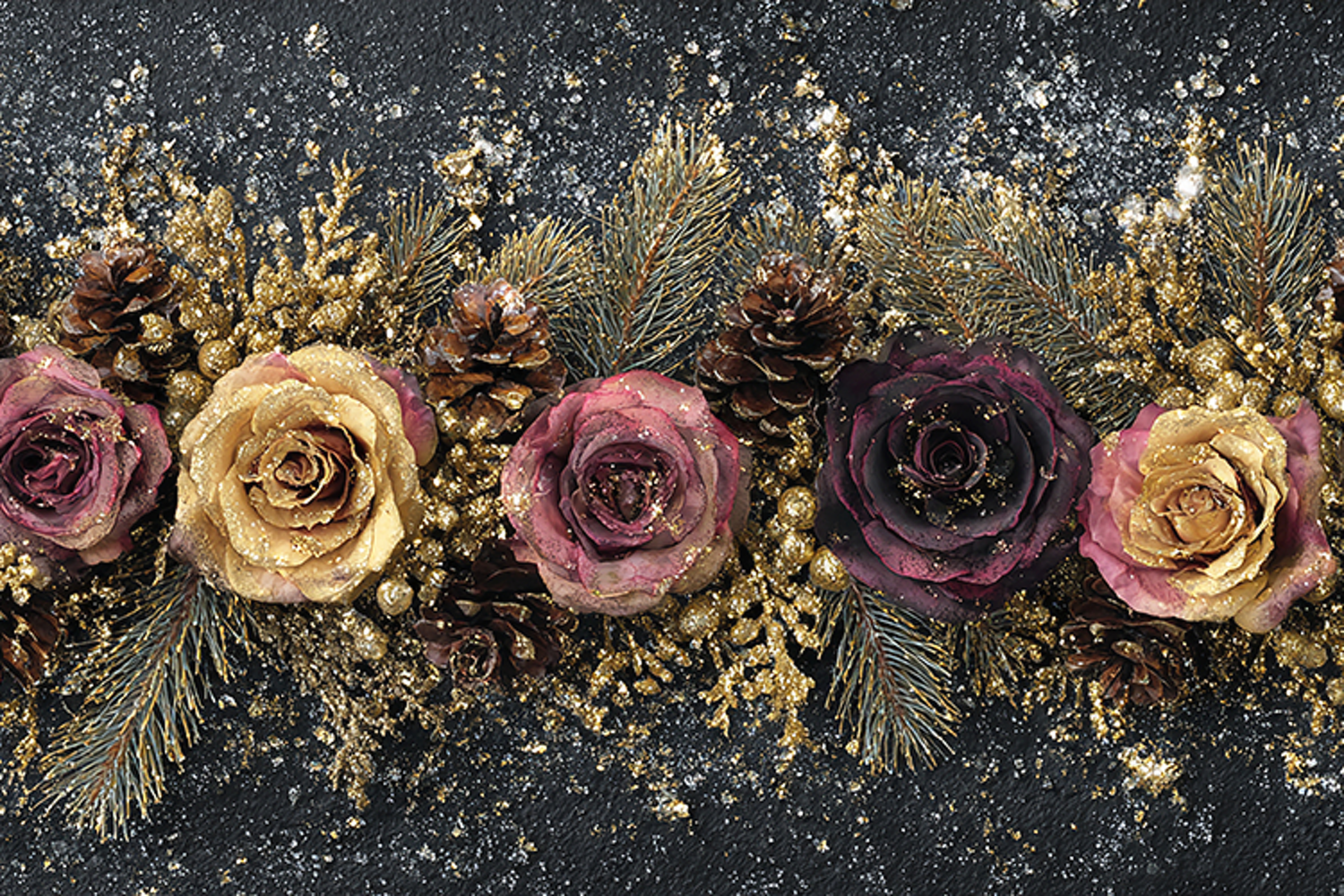Elegant Christmas Winter Luxury Roses Festive Gold Glitter Floral Border Dark Background Pinecones