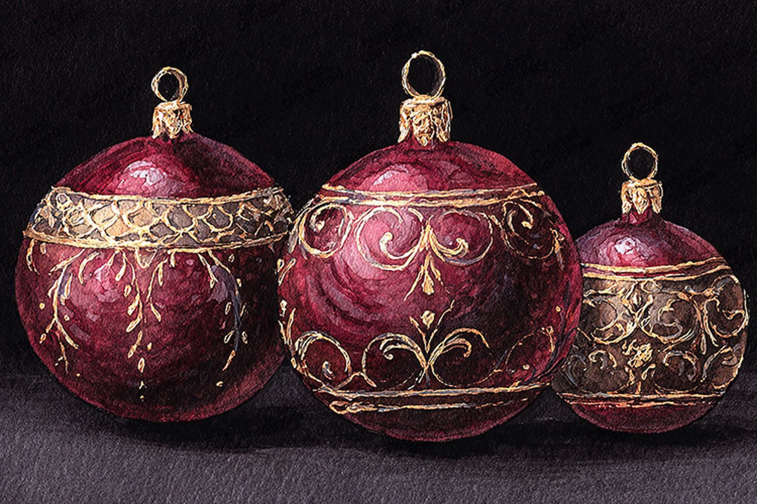 Watercolor Maroon Gold Christmas Ornaments Dark Elegant Art