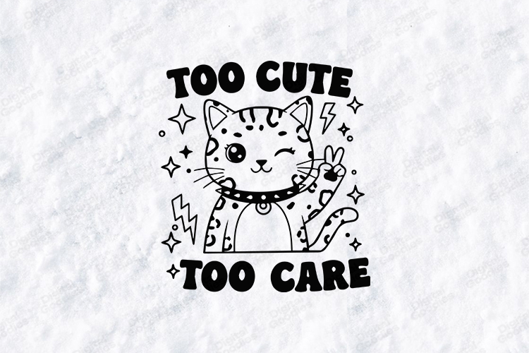 Cute kitty design with too cute too care quote and peace sign pose. Perfect for T shirts, mugs, kids outfits and Cricut crafts. Includes SVG, PNG and JPG high resolution files. Ideal for printing, sublimation, vinyl and creative DIY projects.