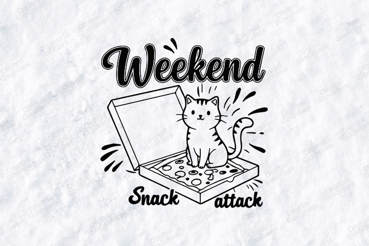 Weekend Snack Attack cat design with pizza box illustration. Perfect for T shirts, mugs, tumblers and Cricut crafts. Includes SVG, PNG and JPG high resolution files. Great for printing, vinyl, sublimation and DIY projects.