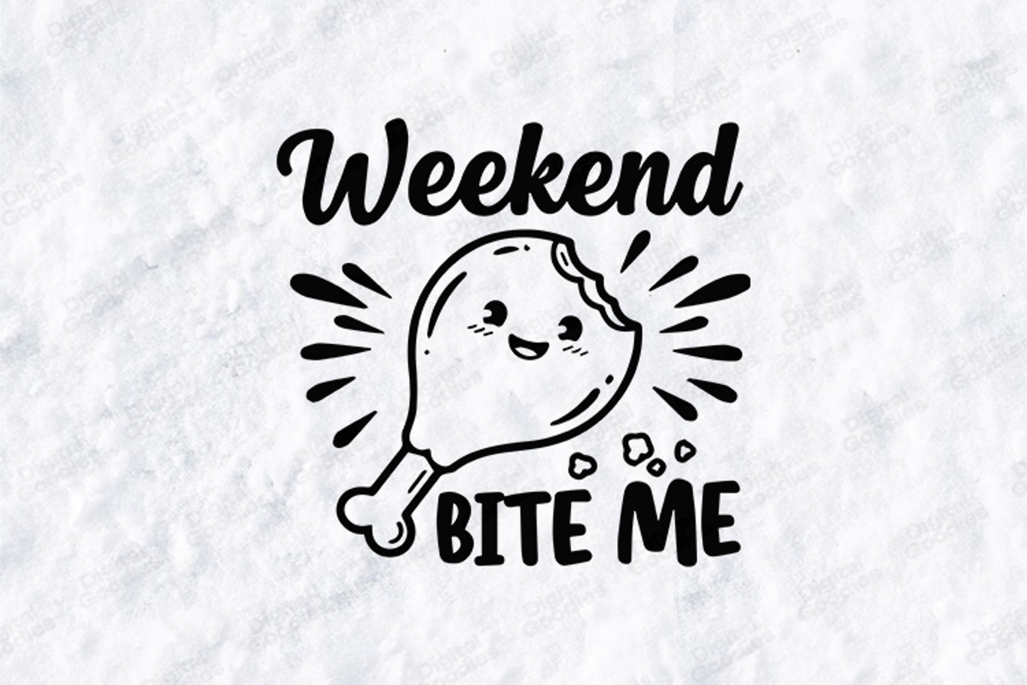 Weekend Bite Me chicken drumstick design with cute face and splash elements. Perfect for T shirts, mugs, tumblers and Cricut projects. Includes SVG, PNG and JPG high resolution files. Ideal for printing, vinyl, sublimation and DIY crafts.