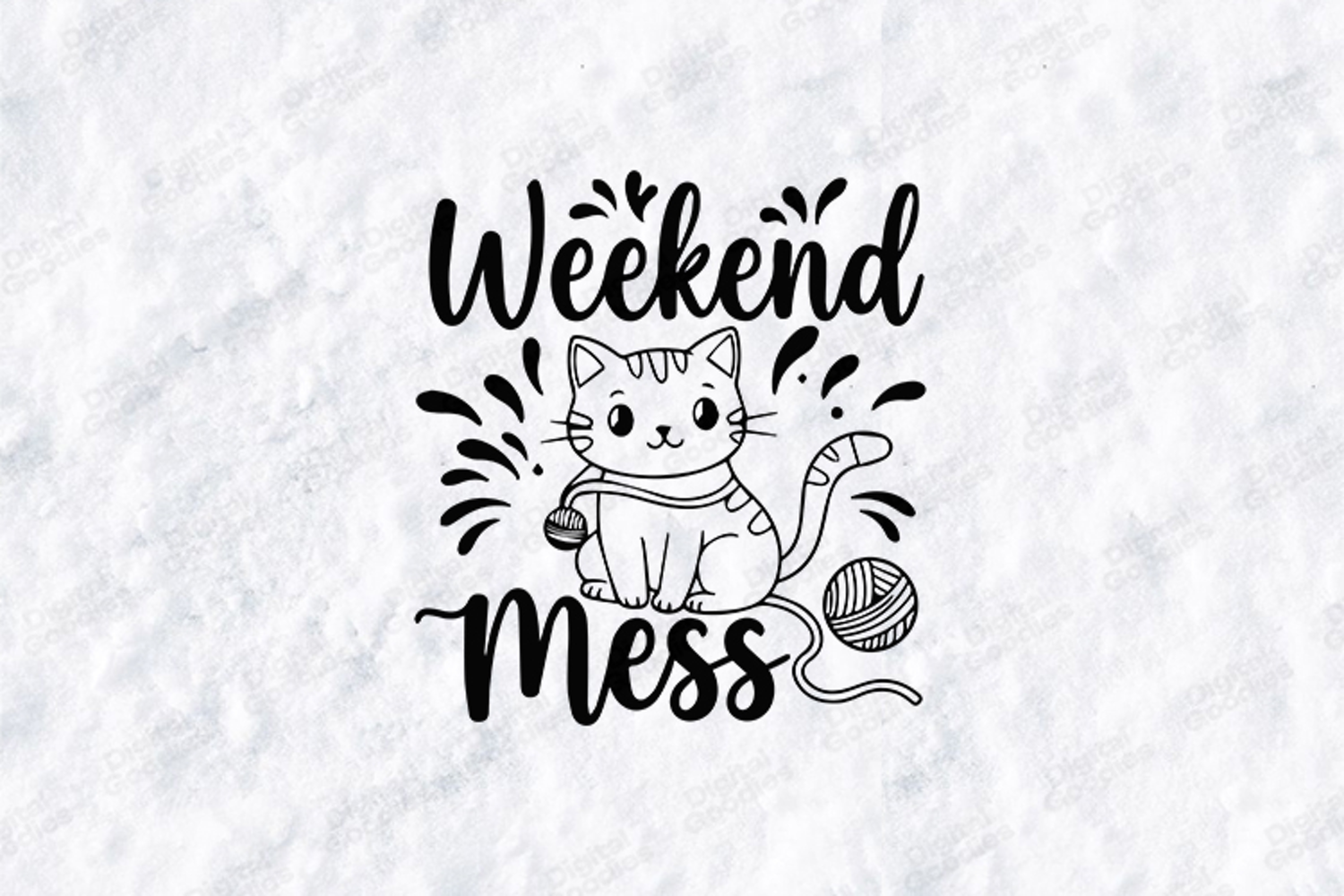 Weekend Mess cat design with yarn balls and splash elements. Perfect for T shirts, mugs, tumblers and Cricut crafts. Includes SVG, PNG and JPG high resolution files. Ideal for vinyl, sublimation, printing and DIY projects.