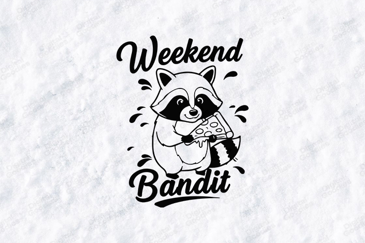 Weekend Bandit raccoon holding pizza themed graphic design for shirts, mugs and crafting projects. Fun artwork for printing and DIY decoration. Includes SVG, PNG and JPG files in high resolution for clean and quality use.
