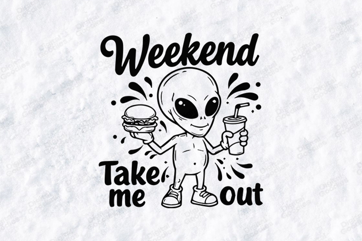 Weekend Take Me Out alien holding burger and drink illustration. Fun design for shirts, mugs, stickers and DIY projects. Comes in high quality SVG, PNG and JPG for clean printing and crafting use.