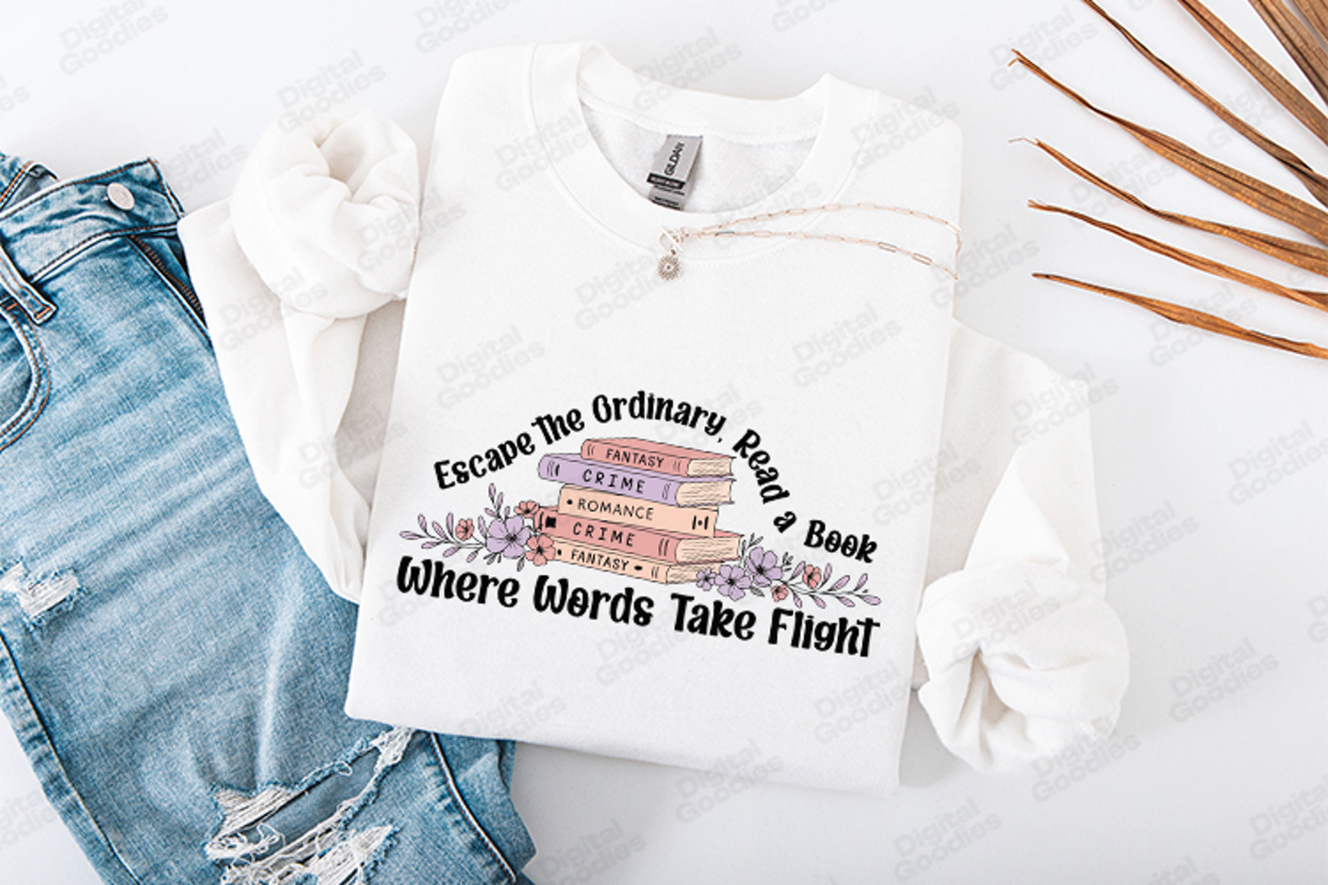 Elegant “Escape The Ordinary Read A Book Where Words Take Flight” design featuring a stacked book illustration and vintage aesthetic. Perfect for book lovers, teachers, librarians and cozy reading apparel. High resolution files work great for T-shirts, hoodies, mugs, tote bags, stickers and print-on-demand crafting.