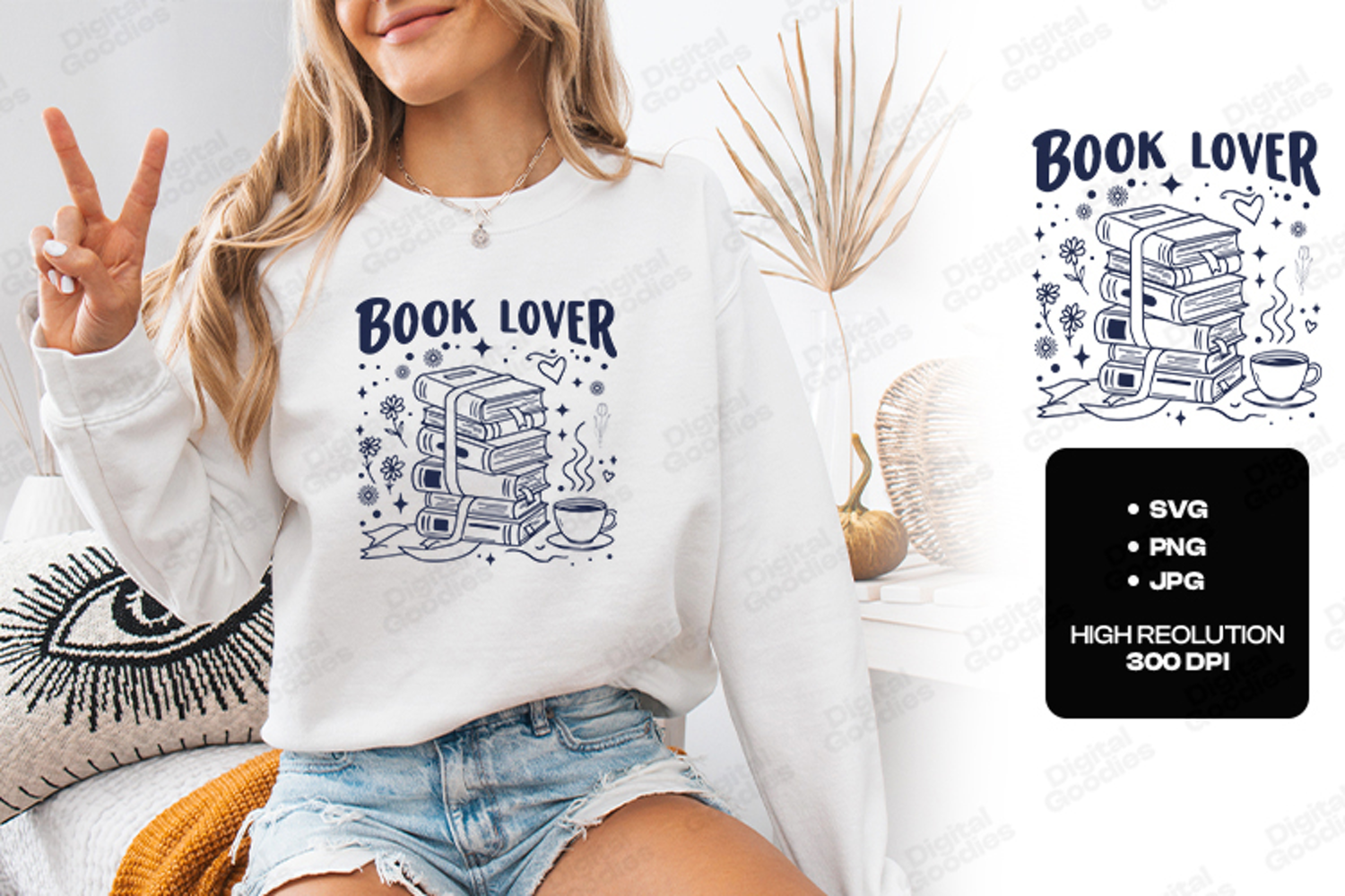 Cute “Book Lover” design featuring a stack of books, hearts, flowers and coffee cup accents. Perfect for book lovers, teachers, librarians and cozy reading themed apparel or gifts. High resolution files are ideal for T-shirts, hoodies, mugs, tote bags, stickers and print-on-demand projects.