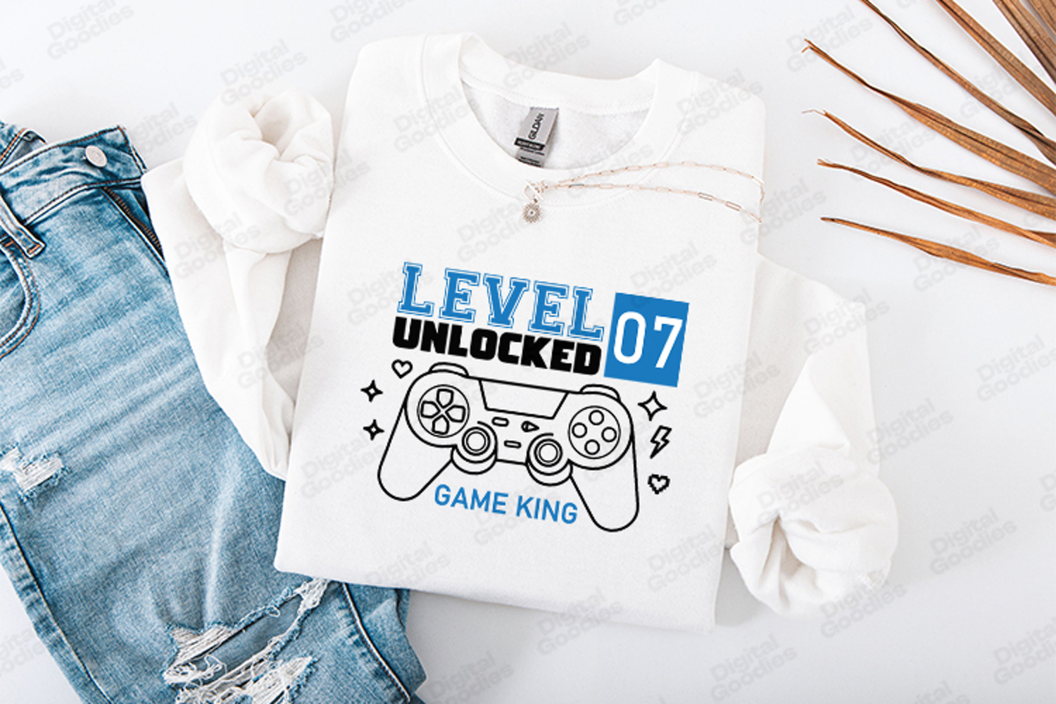Level Unlocked 07 gaming birthday design with game controller graphic. Perfect for boys, gamer kids, birthday party shirts, hoodies and gifts. High quality files for Cricut, Silhouette and print on demand crafts.
