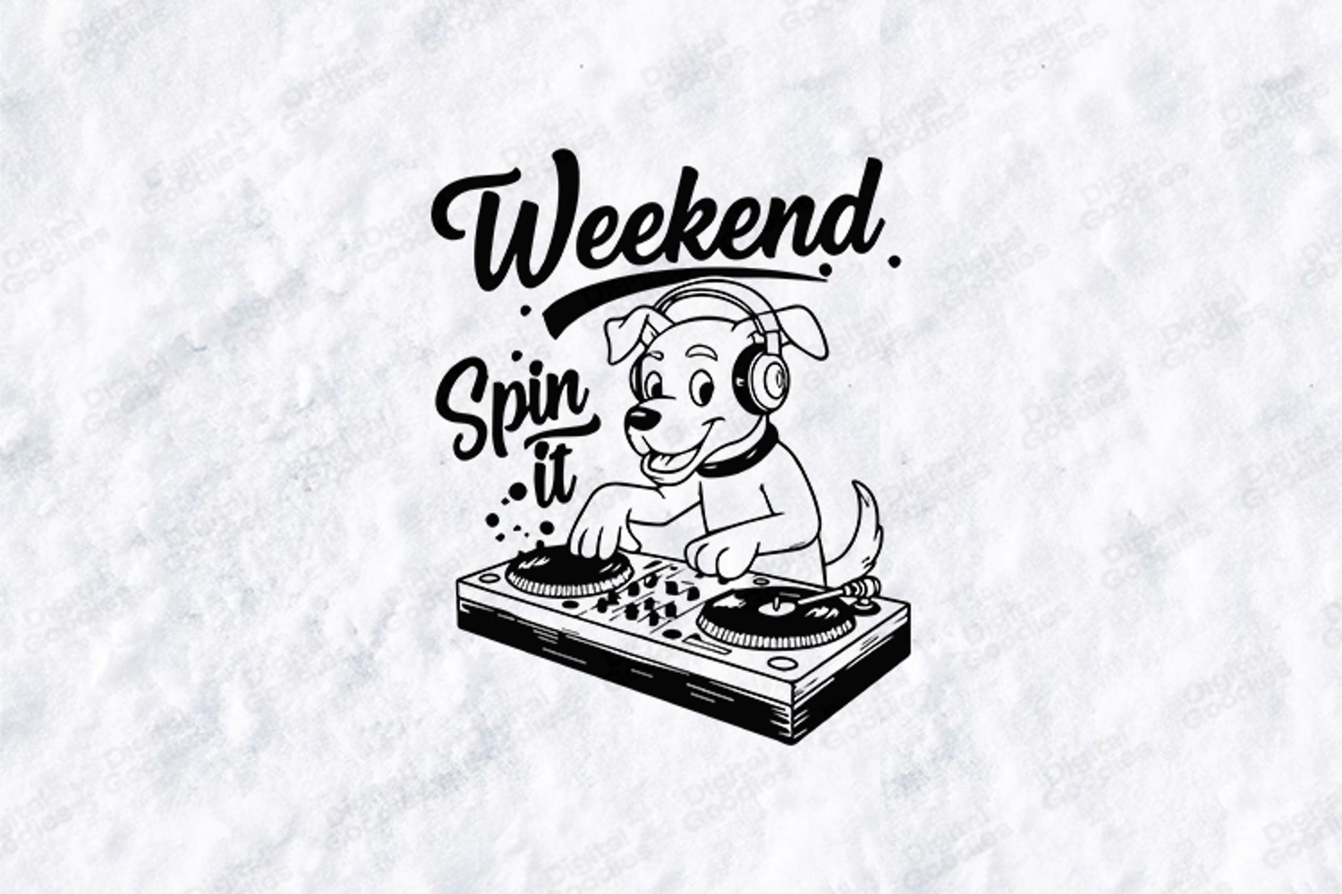 Weekend Spin It SVG featuring a cool dog DJ on turntables. Perfect for shirts, mugs, bags and craft projects. Includes high quality SVG, PNG and JPG formats for easy printing and cutting.