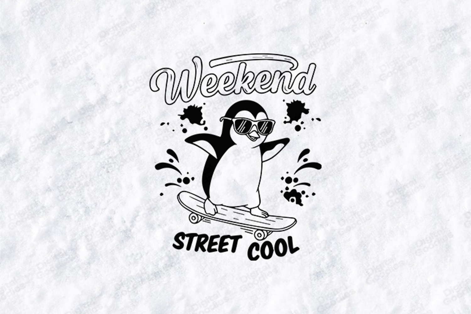 Weekend Street Cool SVG featuring a funny penguin on a skateboard with sunglasses. Great for shirts, party themes, print projects, vinyl cutting, mugs, and fun weekend designs. Includes SVG PNG and JPG in high resolution.