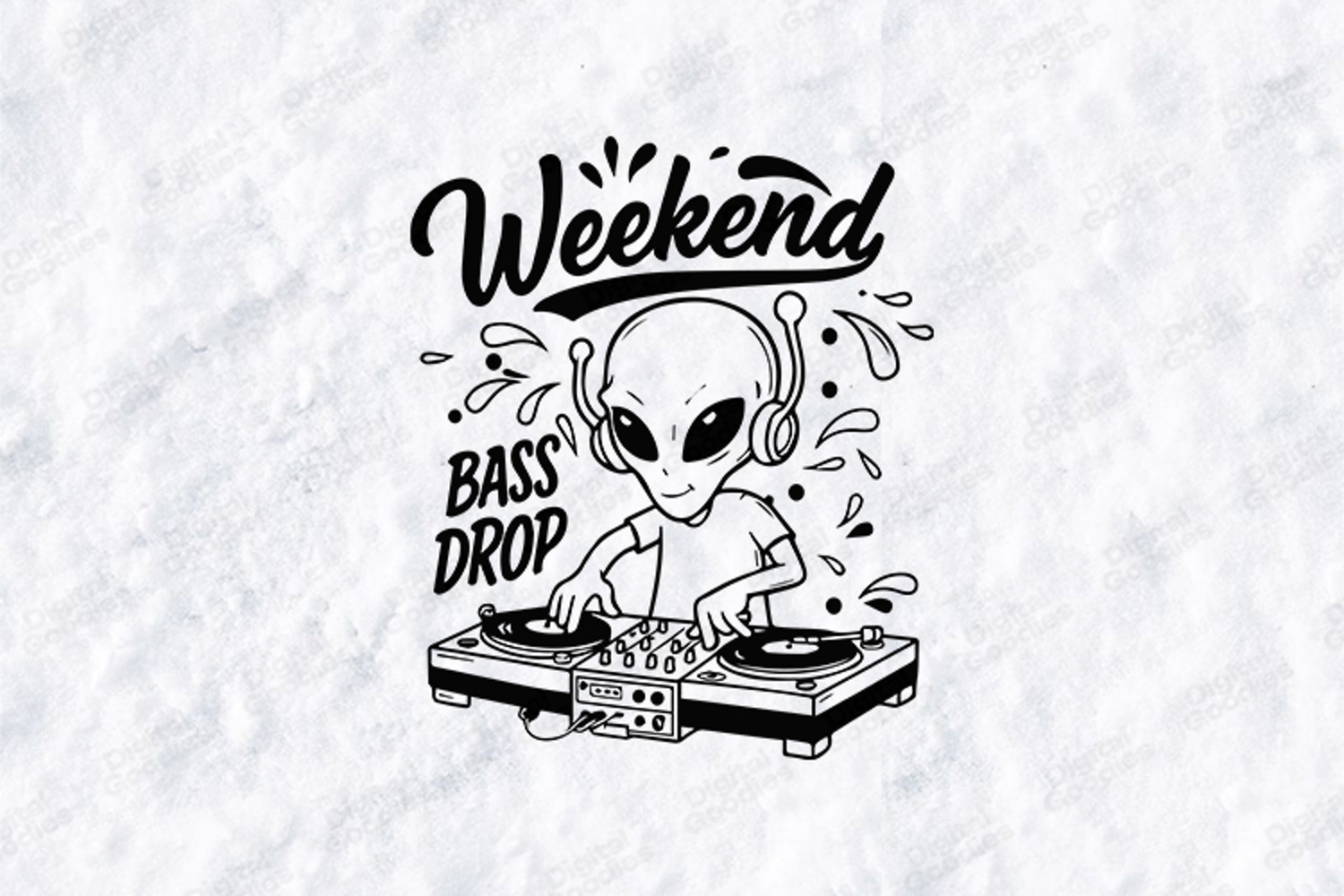 Weekend Bass Drop SVG featuring a cool alien DJ on turntables. Ideal for shirts, party themes, vinyl cutting, print projects, mugs, and fun weekend designs. Includes SVG PNG and JPG in high resolution.