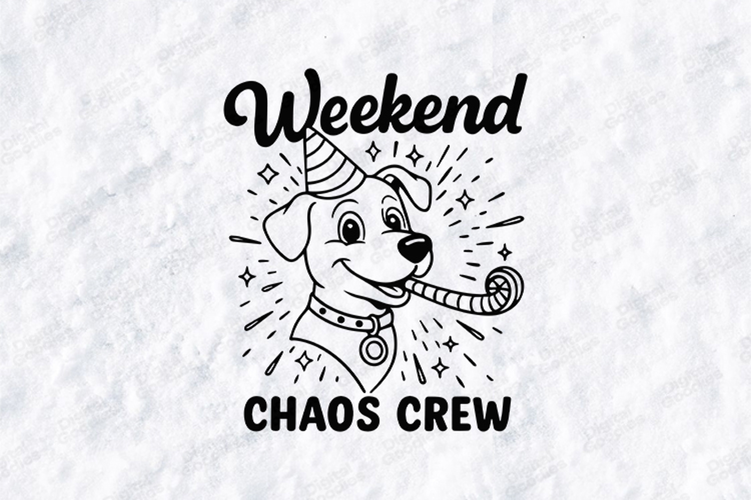 Weekend Chaos Crew Dog Tshirt Design With Cute Party Themed Illustration And Bold Lettering. Perfect For Printing, Apparel, Vinyl, Mugs And Crafting Projects. Ideal For Weekend Outfits, Pet Lovers And Fun Party Fashion.