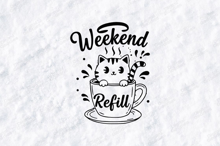 Weekend Refill Coffee Cat Tshirt Design With Cute Mug Illustration And Bold Lettering. Perfect For Printing, Apparel, Vinyl, Mugs And Crafting Projects. Ideal For Weekend Outfits And Coffee Lover Fashion.