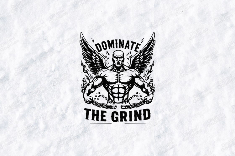 A bold “Dominate The Grind” gym design featuring a powerful muscular figure with wings, chains, and dynamic flames — symbolizing strength, discipline, and unstoppable drive. Perfect for athletes, bodybuilders, and fitness enthusiasts who push beyond limits.